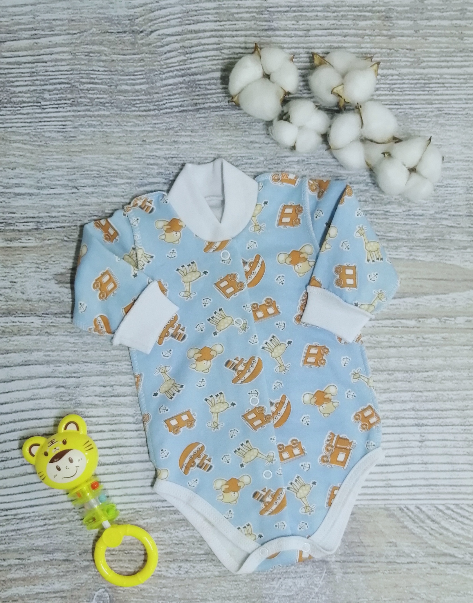 Боди с длинным рукавом, спереди и между ножек на кнопочках.