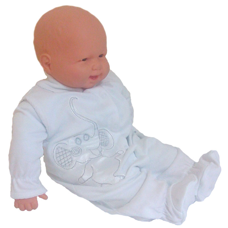 1. Полукомбинезона с закрытыми ножками, спереди и между ножек на кнопочках. Комбинезон украшен спереди и сзади аппликацией в виде слонёнка.